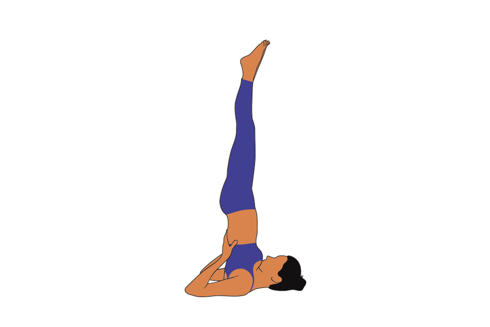 Lie on your back with hands by your side. With a single movement, lift your legs, buttocks, and back so that you come up high on your shoulders. Support your back with your hands.